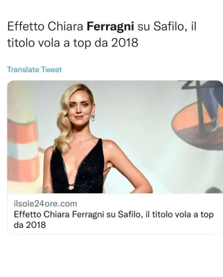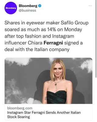 Come era avvenuto per la più articolata alleanza della imprenditrice con Tod's e per la collaborazione con Monnalisa, il titolo Safilo ha preso il volo in Borsa ottenere un guadagno in avvio di seduta oltre il 13%."Siamo entusiasti di ospitare nel nostro portafoglio una delle più famose e influenti imprenditrici digitali al mondo", ha dichiarato Trocchia. "Safilo rappresenta non soltanto un'eccellenza nell'eyewear ma anche, come il mio marchio, un grande esempio di spirito italiano con una valenza globale", ha dichiarato Chiara Ferragni, Ceo e direttore creativo del brand Chiara Ferragni. "Safilo ha fortemente creduto nel mio marchio e nel lancio di questa nuova categoria e io li ho scelti per la connessione che ho sentito con i loro valori, l'innovazione e l'impegno per l'eccellenza. Abbiamo lavorato insieme per creare una collezione che non vedo l'ora di presentare l'anno prossimo".