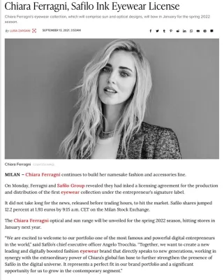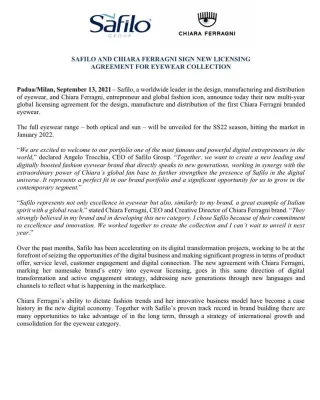 Safilo e Chiara Ferragni hanno firmato un accordo pluriennale per il design, la produzione e la distribuzione della prima collezione eyewear in licenza a marchio Chiara Ferragni . L'intera gamma di occhiali, sia da sole sia da vista, verrà presentata per la Primavera Estate 2022 e sarà disponibile da gennaio prossimo.