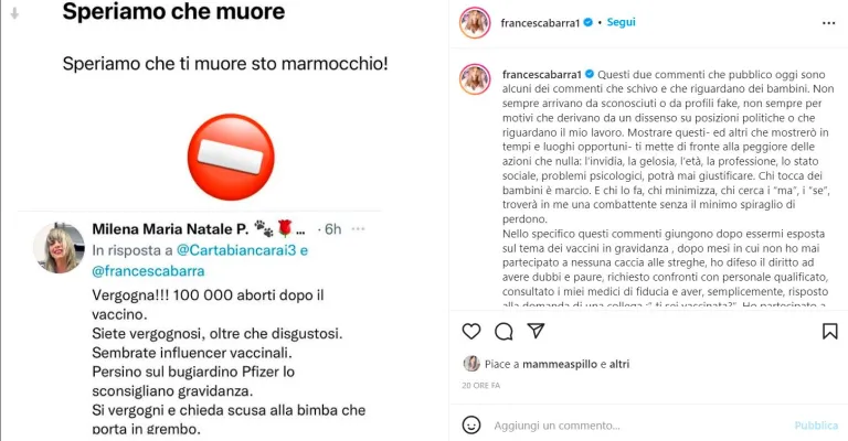 "Questi due commenti che pubblico oggi sono alcuni dei commenti che schivo e che riguardano dei bambini . Non sempre arrivano da sconosciuti o da profili fake, non sempre per motivi che derivano da un dissenso su posizioni politiche o che riguardano il mio lavoro. Mostrare questi ed altri che mostrerò in tempi e luoghi opportuni- ti mette di fronte alla peggiore delle azioni che nulla: l'invidia, la gelosia, l'età, la professione, lo stato sociale, problemi psicologici, potrà mai giustificare. Chi tocca dei bambini è marcio. E chi lo fa, chi minimizza, chi cerca i “ma”, i “se”, troverà in me una combattente senza il minimo spiraglio di perdono .