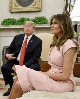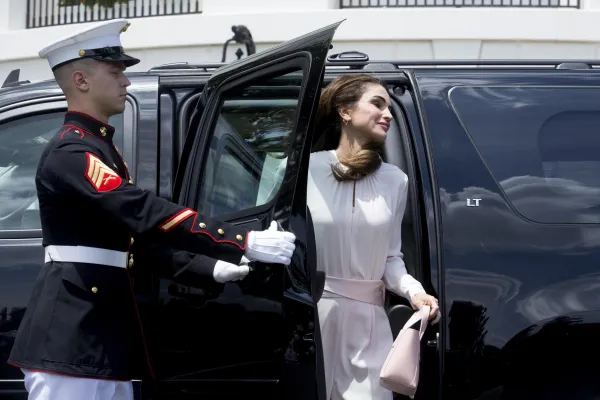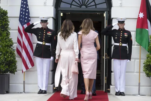 Melania ha indossato un abito rosa tenue Proenza Schouler sbracciato e sotto il ginocchio. Decisamente più castigato il look di Rania che era coperta dal collo ai piedi da un abito con pantalone largo di un rosa più tenue di quello di Melania.