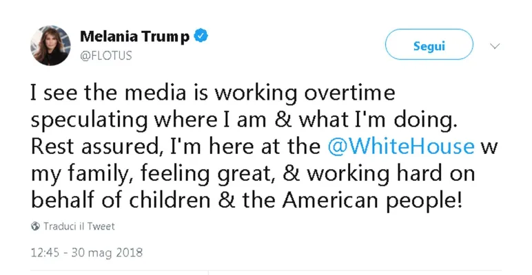 Per mettere a tacere le voci, qualche giorno fa Melania ha scritto su Twitter: "Vedo che i media stanno facendo gli straordinari speculando su dove sono e cosa sto facendo". La first lady Usa ha quindi tranquillizzato tutti spiegando di sentirsi bene: "Vedo che i media fanno gli straordinari ipotizzando dove sono e cosa stia facendo. State tranquilli, sono qui alla Casa Bianca con la mia famiglia, mi sento benissimo e lavoro sodo per i bambini e gli americani!", ha scritto.