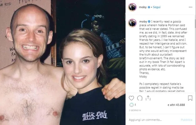 In risposta all'attrice, Moby è andato su Instagram pubblicando una foto della coppia che mostra il cantante a torso nudo con il braccio intorno a una Portman sorridente: "Rispetto Natalie, la sua intelligenza e il suo attivismo - scrive il musicista - ma onestamente non so perché abbia voluto rappresentare in modo errato la realtà riguardo alla nostra frequentazione. La storia raccontata nel mio libro è accurata, con un sacco di foto a testimonianza". Poi un Ps: "Rispetto completamente il possibile rimpianto di Natalie per avermi frequentato (a voler essere onesti, probabilmente anch'io avrei rimpianto di essere uscito con me) ma ciò non altera i fatti reali della nostra breve relazione".