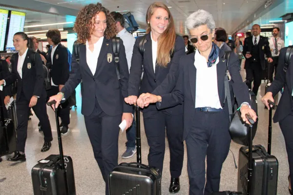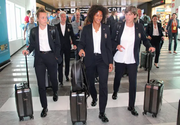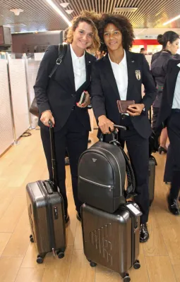 La nazionale di calcio femminile all'aeroporto Leonardo da Vinci di Fiumicino, in partenza per la Francia dove dal 7 giugno al 7 luglio andrà in scena la Coppa del Mondo di calcio al femminile, 2 giugno 2019.