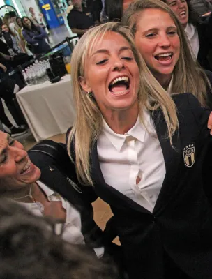 (S-D) Valentina Cernoia, Sara Gama e la Ct della nazionale di calcio femminile, Milena Bertolini.