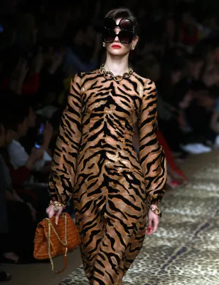 In passerella non c'è un logo o una T-shirt, è tutto puro lusso, dal completo in coccodrillo con la camicia a stampa Jungle all'abito in rete di cotone all'uncinetto con applicazioni di animali tropicali, dal tubino con frange effetto erba portato con l'intimo di paillettes a quello ispirato ai vecchi centrini. E poi gli abiti lunghi e trasparenti tutti stampati a motivi tropicali, sempre indossati con gli shorts nella stessa fantasia, le vestaglie-trench evanescenti, i completi maschili effetto corteccia con i pantaloni corti e le stringate con pietre dure e strass.