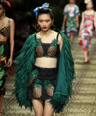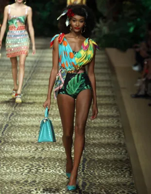 Il tutto alternato alle mise coloniali - trench, sahariana, cargo - e ai grandi classici della maison: l'abito guepiere, il modello a corsetto, il completo pantaloni trasparente, il capo nero di tulle con applicazioni di pizzo fatto all'uncinetto, il bolerino e la mini sagomata proposti per la prima volta nel 1992. Una sensualità giocosa, da pin up anni 50, che esplode nel costume da bagno drappeggiato, nelle gonne a pareo di seta stampata a motivi ananas o cocco, nelle pencil skirt maculate. Un sexy non provocante, perché " la nostra generazione ha vissuto la sessualità con dei tabù, oggi invece - spiega Gabbana- i giovani la vivono in modo diverso, hanno un approccio più semplice, addirittura disinteressato, non c'è la morbosità che potevamo avere noi". Così, "come le ragazzine che magari indossano degli shorts inguinali ma non lo fanno in modo provocatorio", in passerella "non ci sono provocazioni", perché "la moda oggi - conclude lo stilista - ha un approccio più soffice alla sensualità".