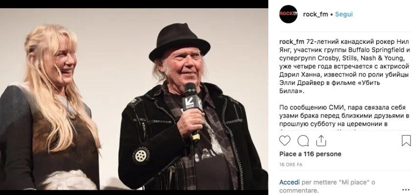 Settantadue anni lui, 57 lei. Lui è il cantautore canadese Neyl Young, quello del mitico gruppo Crosby, Still, Nash & Young, quello delle ballate maledette e del country alternativo di "Harvest". Lei è l'attrice statunitense Daryl Hannah, indimenticabile sirena bionda di "Splash - Una sirena a Manhattan" e già compagna di J.F.Kennedy jr. e del cantautore Jackson Brown. Ebbene i due si sono sposati in un epilogo romantico d'estate. E naturalmente lo hanno fatto in gran segreto, così come hanno sempre condoto la loro storia d'amore nata nel 2014.