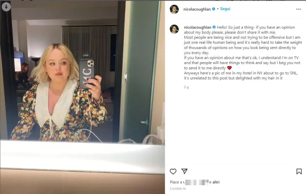 "Se avete un'opinione su di me – continua l’attrice - va bene, lo capisco, sono in tv e la gente ha cose da pensare e da dire, ma vi imploro di non mandarle direttamente a me". Nicola Coughlan ha inoltre chiesto che si smetta di chiedere alle donne il loro peso nelle interviste, soprattutto quando è del tutto irrilevante.