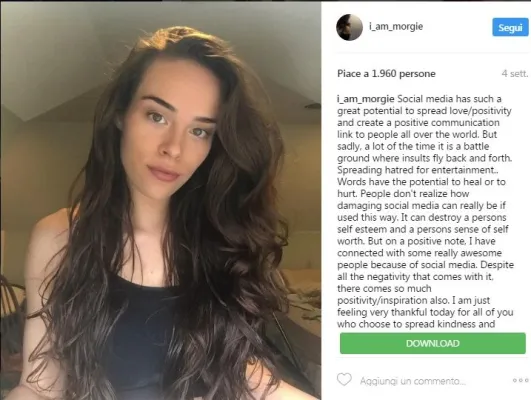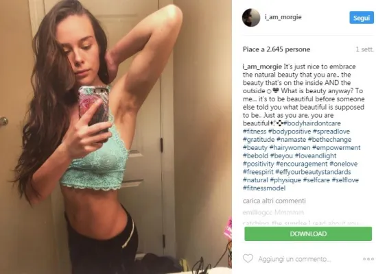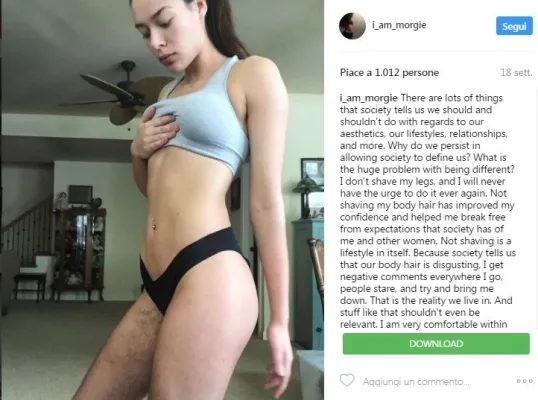 Morgan Mikenas è una fitness blogger americana che ha deciso di non depilarsi più e di liberarsi per sempre dalla schiavitù della ceretta, del rasoio, della luce pulsata e di tutti quei metodi cui le donne ricorrono per dire addio ai peli superflui. Morgan, invece, i suoi peli li rivendica in nome della bellezza al naturale. "Non sto cercando di far sì che tutta l'umanità smetta di radersi le ascelle o i peli delle gambe. Voglio solo essere d'ispirazione rispetto allo scegliere di fare ciò che si preferisce, ciò che ci fa sentire più a nostro agio. Vorrei che nessuno si vergognasse di sé, non è giusto che la gente senta di doversi adeguare a una norma culturale. Fate semplicemente quello che vi fa stare bene!": queste sono le parole di Morgan, blogger molto seguita su Instagram, ormai convinta che l'esigenza di depilarsi sia frutto di una convenzione sociale che accresce le differenze di genere. Sul suo profilo Instagram che conta più di 29.000 followers sfoggia senza alcun imbarazzo gambe, inguine e ascelle non depilate. Da adolescente è stata anche vittima di bullismo per la sua peluria. Quando Morgan aveva 12 anni, infatti, veniva presa in giro dalla compagne di classe perché le crescevano i peli sulle gambe. Qualcosa di normale, in fondo, ma per le sue compagne evidentemente non era così. Ora è stanca e ha deciso di non subire più questa convenzione sociale. Foto Instagram