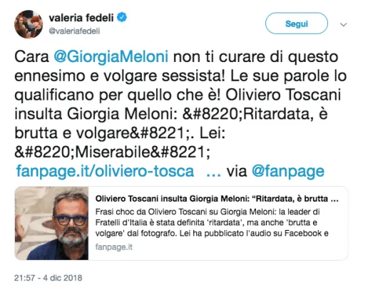 L’attacco non è passato inosservato sui social dove in tanti hanno replicato a Toscani, tacciando lui di “volgarità”, “sessismo” e discriminazioni personali. E la stessa Giorgia Meloni ha così replicato: “Il radical chic (con tessera Pd in tasca) Oliviero Toscani, fotografo di Benetton, dice alla trasmissione “La Zanzara” che io sono “brutta e volgare”, che “gli dà fastidio la mia estetica” e che “sono ritardata”. Non risponderei a qualcuno che disistimo così profondamente, se non ci fossero in queste poche parole svariate forme di razzismo viscerale. Razzismo contro le donne, costrette - indipendentemente da ciò di cui si occupano - a dover rendere conto del loro aspetto fisico. E, molto peggio, razzismo verso il dramma di chi soffre di disturbi psichici. Voglio dire che sono profondamente fiera che la mia presenza dia fastidio a una persona così miserabile”.
