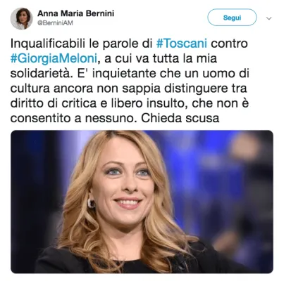 Ma anche di Mariastella Gelmini di Forza Italia che twitta: “Le parole di Toscani non fanno un buon servizio alla sua storia. Alzare i toni non sempre aiuta a fotografare le persone e gli insulti a una donna come Giorgia Meloni offendono lei, il buon senso e chi soffre di disturbi psichici".