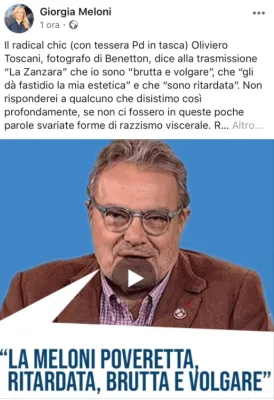 Oliviero Toscani, ospite del programma radiofonico “La zanzara” su Radio 24, ha attaccato pesantemente Giorgia Meloni. Secondo il fotografo reso popolare dalle campagne pubblicitarie per Benetton, la leader di Fratelli d’Italia, è “una poveretta. Una ritardata. Brutta e volgare. Mi dà fastidio la sua estetica. È fastidiosa”. Un attacco che non coinvolge le differenti idee di due persone, ma ancora una volta l’aspetto fisico di una donna.