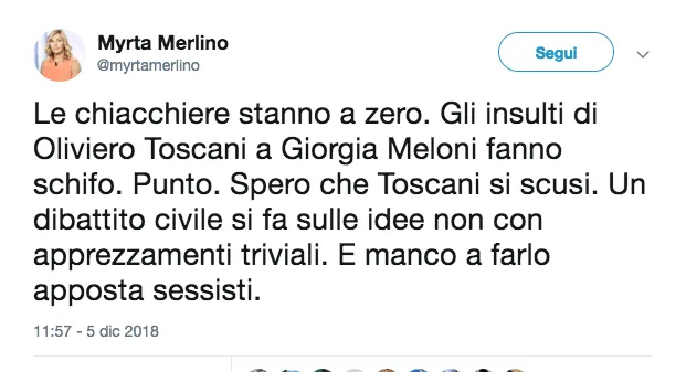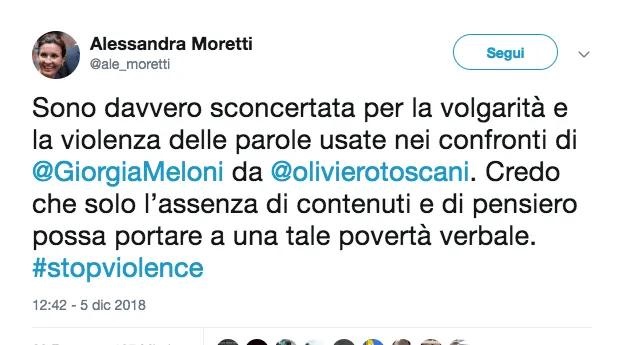 Nel suo post Giorgia Meloni inserisce anche l’audio del programma condotto da Giuseppe Cruciani e da Davide Parenzo. Tra i tanti che hanno preso le difese di Giorgia Meloni, molte colleghe di diversi partiti e opposte convinzioni politiche. Come nel caso di Alessia Morani del Pd che scrive: Le offese di #Toscani a Giorgia Meloni sono inaccettabili. Questo dibattito pubblico tribale deve finire. Basta davvero. Se ne facciano carico tutti. Ma proprio tutti”.