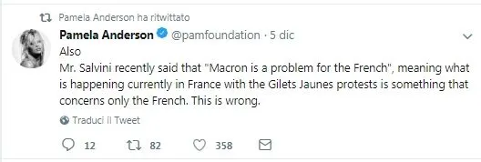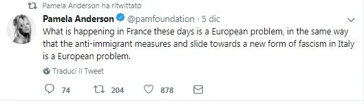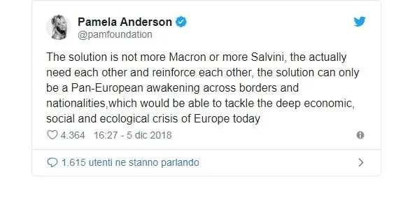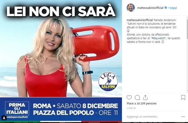 Pamela Anderson contro Matteo Salvini. E arriva la replica