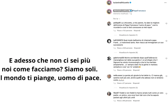 Anche Alba Parietti ha ricordato Papa Francesco con una lunga dedica: "La pace non si costruisce mai con le armi ma aprendo il cuore. Io non sono praticamente ma è l’unico Papa che ha toccato nel profondo la mia coscienza e il mio cuore e mi ha fatto ritornare a credere. Non ho molte parole solo grande dispiacere e grande dolore di aver perso un altro padre. Il Padre di tutti noi. Il padre degli ultimi dei più deboli. Il Padre che ci faceva sentire tutti importanti tutti uguali. Da oggi siamo tutti più poveri e soli. Papa Francesco era la nostra coscienza contro ogni egoismo , individualismo, guerre , ingiustizie. Inclusione , fraternità. L’ultima visita alle carceri , perché per lui nessuno era uno scarto della società".