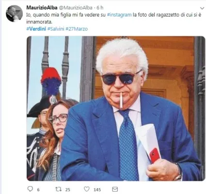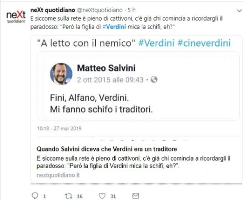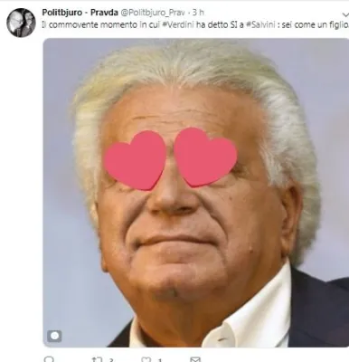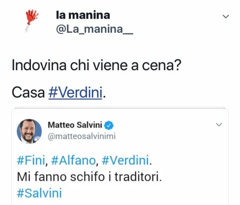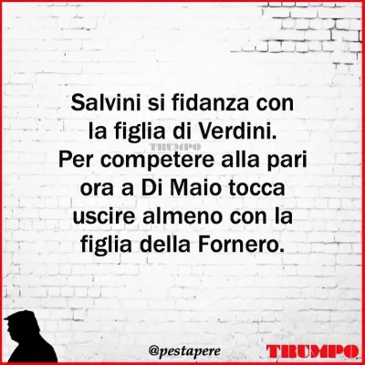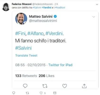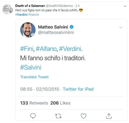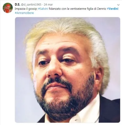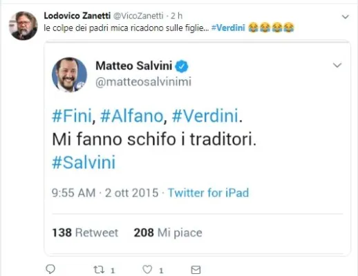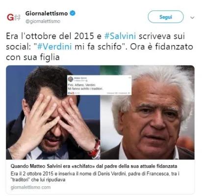 C'è il fotomontaggio davvero "da paura" con il volto di matteo Salvini e la capigliatura dell'ex senatore di Forza Italia Denis Verdini. Ci sono battute come "Salvini si fidanza con la figlia di Verdini. Per competerealla pari ora a Di Maio tocca uscire almeno con figlia della Fornero". Poi ci sono quelli che recuperano un tweet del 2015 in cui Salvini si scagliava contro "tre traditori" e distribuisìva i loro nomi con tanto di hashtag per darli in pasto ai suoi follower. Ecco uno di questi tre nomi era proprio quello di Verdini, che era passato dal Centro Destra al sotegno del governo di Centro Sinistra di Matteo Renzi. Oggi in tanti recuperano quel tweet e, beffardi, ci allegano gif esilaranti a commento o battute alla : "Indovina di chi viene a cena?". Insomma in questi giorni i social e, come sempre in questi casi, Twitter in particolare si sono scatenati. A far divertire tanti utenti è il fatto che la nuova fidanzata del ministro dell'Interno, Francesca Verdini, sia la figlia dell'ex senatore di Forza Italia, ovvero di colui che Salvibi fino a poco più di un anno e mezzo fa considerava uno dei suoi peggior nemici. Ma, come si, al cuor non si comanda...