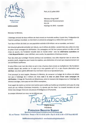 Nel 2015, quando la notizia si diffuse, Brigitte Bardot, icona del cinema francese e presidentessa della fondazione per i diritti degli animali che porta il suo nome, saltò sulla sedia. Uccidere 2 milioni di gatti? Scandaloso, dirà in una lettera del 21 luglio di quell’anno a Greg Hunt, l’allora ministro dell’Ambiente del gabinetto di Tony Abbot, consigliandogli di spendere i 6 milioni previsti per lo sterminio dei gatti in una campagna di sterilizzazione, ricordandogli la collaborazione in tal senso tra la sua fondazione e Vet Beyond Borders, organizzazione veterinaria australiana senza scopo di lucro: “Oltre che crudele, uccidere i gatti è inutile, altri gatti randagi si moltiplicheranno. La mia Fondazione lavora da anni sull’argomento e le garantisco che non esiste altra alternativa se non quella di sterilizzare. I gatti operati difendono il loro territorio ma non si riproducono più. Pertanto, la prego, signore, di devolvere il budget di 6 milioni non per l’abbattimento di 2 milioni di gatti, ma per la creazione di una vasta campagna di sterilizzazione. L’immagine dell’Australia è disastrosa, tra massacri di canguri e di cavalli selvaggi, il suo paese è lontano dall’essere esemplare”.