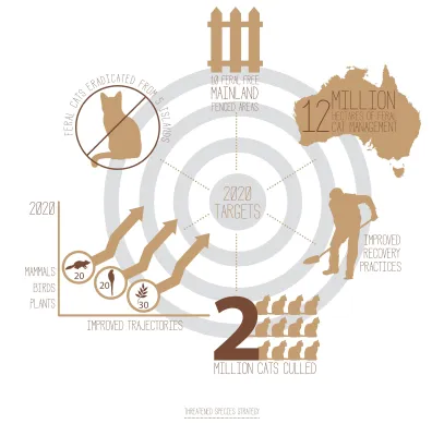 Un primo piano per la riduzione dei gatti selvatici è stato allestito nel 1999 sotto l’ombrello dello Environment Protection and Biodiversity Conservation Act. Nel luglio 2015 a Melbourne con una dichiarazione nazionale i gatti selvatici sono stati dichiarati parassiti, considerando la loro gestione una priorità per la protezione e il recupero delle specie minacciate, con un occhio a una migliore custodia di quelli domestici e uno di forzata compassione verso i gatti randagi sparpagliati tra agglomerati urbani e aree rurali e nutriti dall’uomo. Dal 2015 il piano contro i gatti selvatici, che ambisce a ucciderne 2 milioni entro il 2020, è il Threat abatement plan for predation by feral cats.
