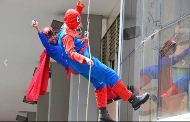 Pompieri vestiti da Spiderman e Superman sui tetti dell'ospedale Bambin Gesù