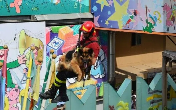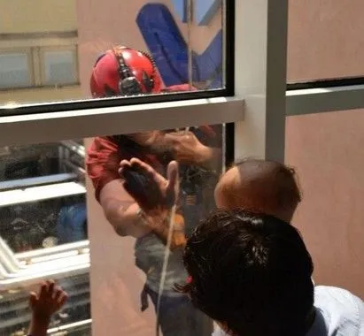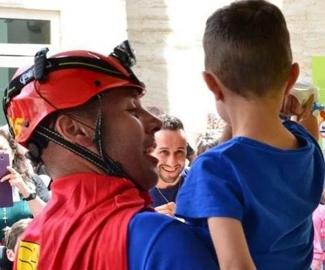 Due pompieri con maschere e mantelli si sono calati dalla terrazza del padiglione Sant?Onofrio fin dentro il Castello dei Giochi per distribuire gadget a forma di cuore ai piccoli pazienti. I ?vigilieroi? hanno scalato il palazzo di vetro e poi sono scesi a terra per abbracciare i bambini e scattare foto ricordo. L'appuntamento è stato organizzato dall'ospedale pediatrico romano in collaborazione con il Corpo Nazionale dei Vigili del Fuoco (i due pompieri appartengono al nucleo speleo-alpino-fluviale) e l'associazione Tabor International (foto BAMBINOGESU@)