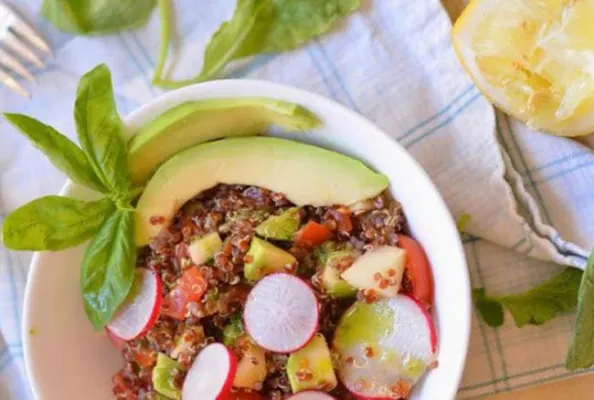 (www.melarossa.it) Insalata di quinoa rossa, mela verde e avocado: Ingredienti per 4 persone: 260 g di quinoa rossa; 2 mele verdi; 1 mazzo di ravanelli; mezzo avocado; 20 pomodorini; 1 limone; 2 cucchiai di olio extra vergine d?oliva; basilico q.b.;