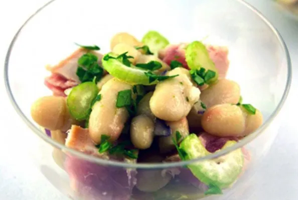 Preparazione: Scotta il tonno un minuto per lato su una griglia, taglialo a cubetti regolari, trasferiscili in una ciotola, aggiungi i fagioli, il sedano, la cipolla tagliati a cubetti piccoli, il prezzemolo tritato finemente, la scorza grattugiata di un limone, l'olio, sale e pepe.