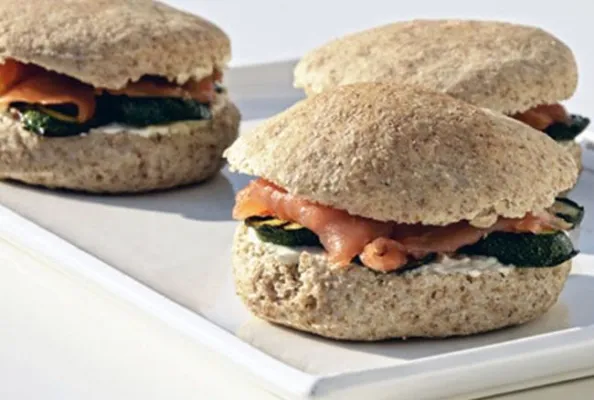 Preparazione: Farcisci il panino con il formaggio spalmabile, mescolato a del basilico sminuzzato, nastri di zucchine grigliate e condisci con sale, olio e pepe e fettine di salmone affumicato.