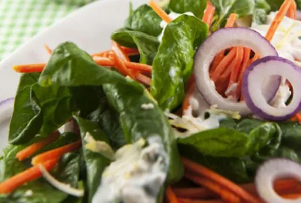 (www.melarossa.it) Spinacini con feta: Ingredienti per 4 persone: 280 gr di spinacini da insalata già puliti; 4 carote; 210 gr di feta; 320 gr di yogurt bianco magro; qualche anello di cipolla rossa; 2 limoni non trattati; 4 cucchiai di semi di zucca; pepe nero; origano; 2 cucchiai di olio extravergine di oliva.