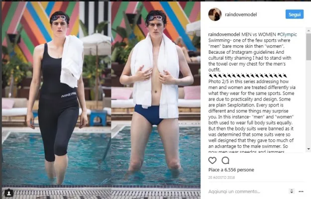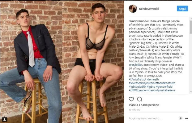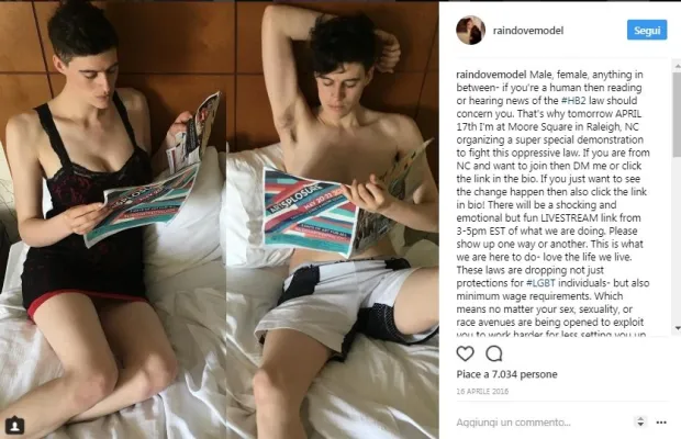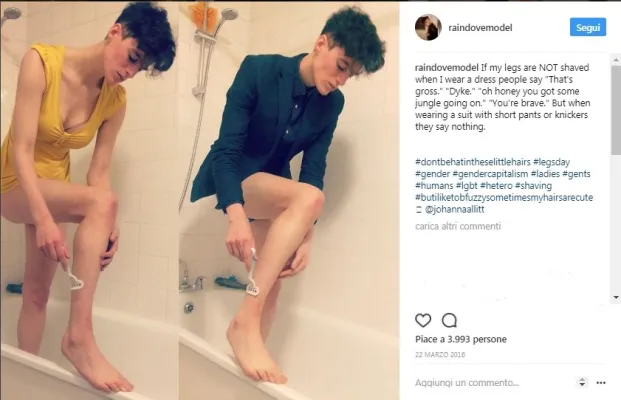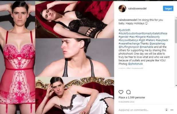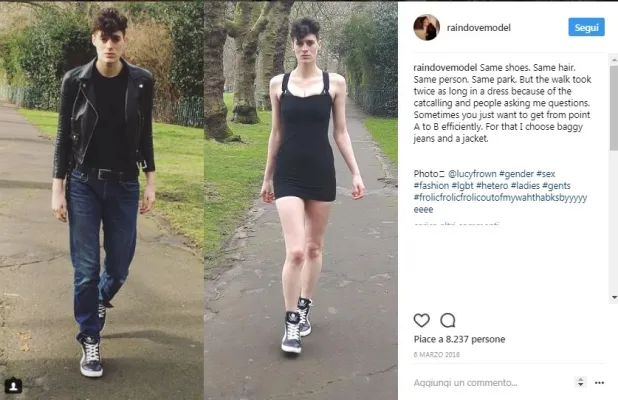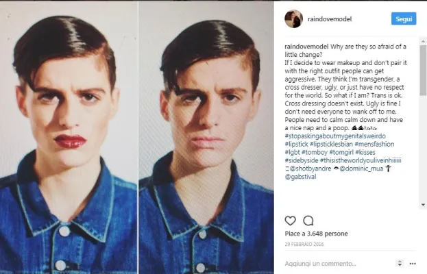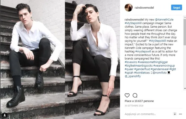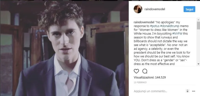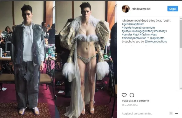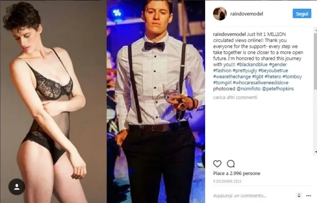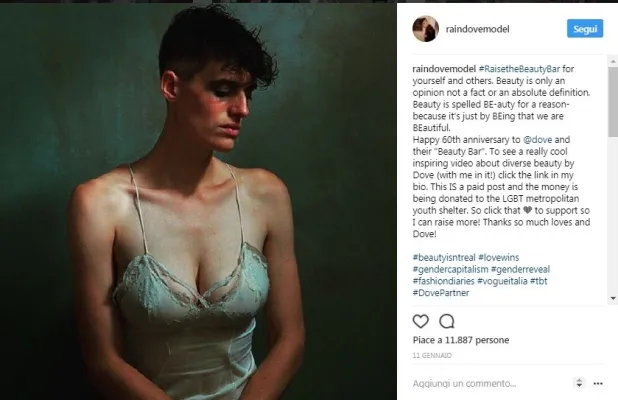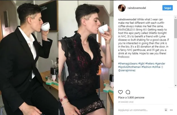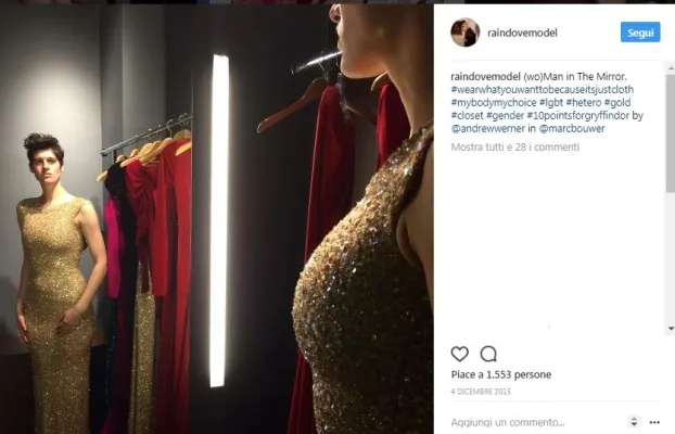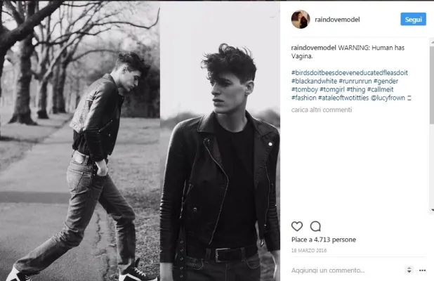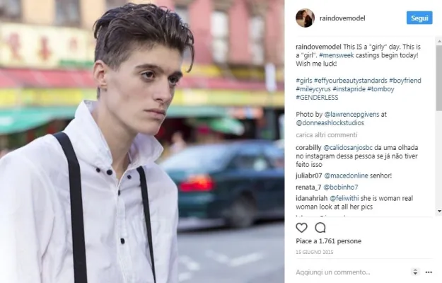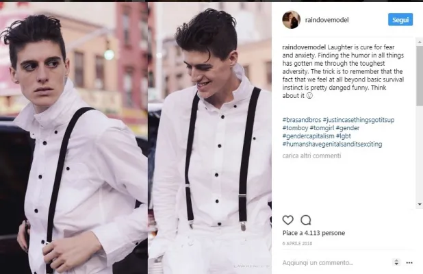 Il suo volto androgino induce a pensare che si tratti di un uomo in realtà Rain Dove è una donna e grazie al suo aspetto è diventata la modella più versatile del mondo, sfila infatti sia per marchi femminili che per marchi maschili. Rain che da piccola si definiva "una brutta ragazza" è riuscita a trasformare quello che poteva essere un difetto in un vantaggio. Nel suo curriculum ora vanta servizi per Vogue, Cosmopolitan, Elle e Marie Claire. Foto Instagram