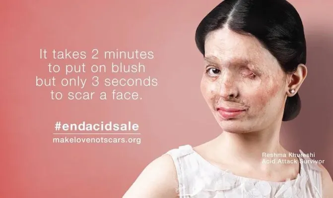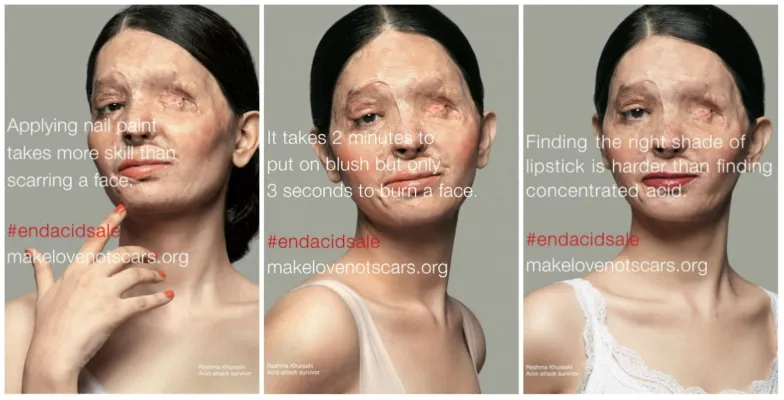 La modella indiana Reshma Qureshi, 19 anni, ha sfilato per la settimana della moda di New York. Sfigurata dall'acido lanciatole addosso da suo cognato quando aveva diciassette anni, Reshma non ha mai smesso di prestare il suo volto per tutorial realizzati da ong indiane in favore di chi, come lei, è stato sfigurato dall'acido. "Non avevo mai pensato", ha dichiarato, "nemmeno nei mei sogni più belli di arrivare qui. Chi ha subìto quello che ho subìto io mi vedrà e prenderà coraggio, e mostreremo alla gente che giudica gli altri in base alle apparenze che ci siamo anche noi"