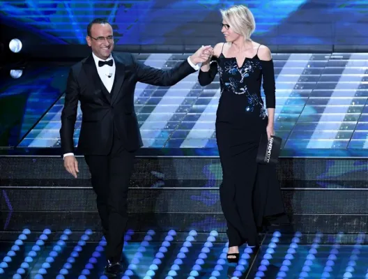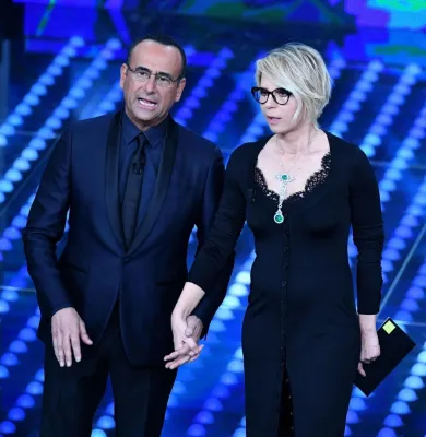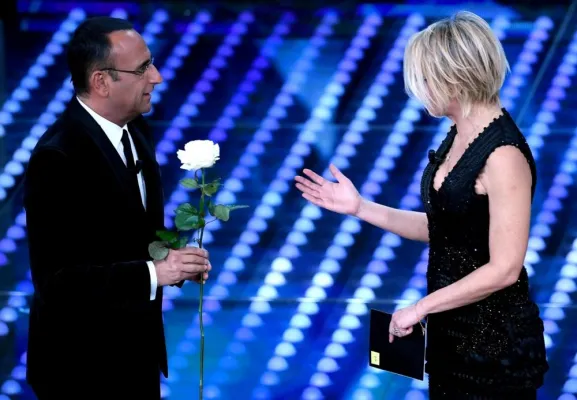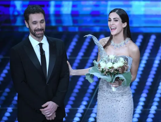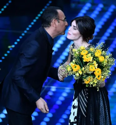 Ed ecco la faccia da Festival, quella stereotipata, tutta sorrisoni impostati, vera protagonista del Festival. Maria la prende in giro cosi' (Ansa)