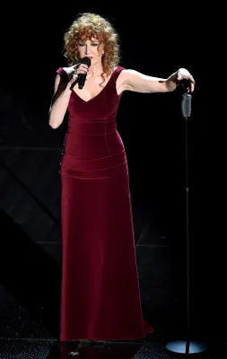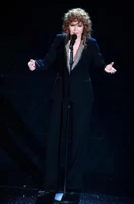 Come un'elegante fiamma. Chic e di grande impatto Fiorella Mannoia nell'ultima serata del Festival (Ansa)