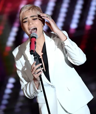 Rosa e bianco, e grande sicurezza per Elodie in finale (Ansa)