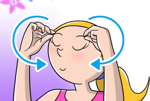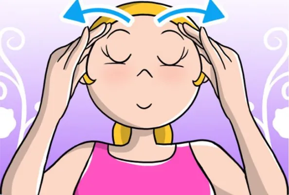 (www.melarossa.it) Massaggio per la testa: Seduta, inizia con un movimento circolare, sfiorando la pelle del viso e del cranio. Respira con la pancia. Alternando le 2 mani, liscia la fronte iniziando dal centro e muovendoti verso le tempie. Premi i pollici sulle tempie partendo dal bordo esterno dell'occhio per arrivare all'attaccatura dei capelli. Ripeti ogni movimento per 5 volte. Illustrazione: Marcello Carriero