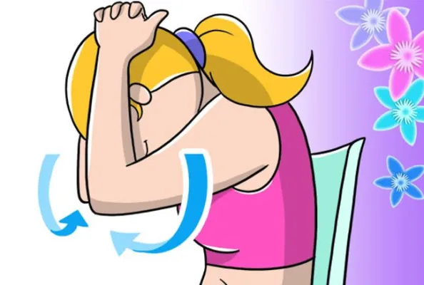 (www.melarossa.it) Massaggio per la nuca: Seduta, incrocia le mani dietro la nuca, pollici liberi. Inspira e abbassa la testa senza spingere con i palmi mentre i gomiti si avvicinano. Tieni la posizione mentre espiri. Risali inspirando e aprendo i gomiti. Illustrazione: Marcello Carriero