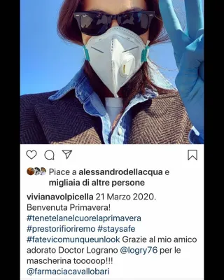 Selvaggia Lucarelli, giornalista e blogger nota per non per essere una che non le manda a dire, stavolta ha preso di mira Viviana Volpicella. La stylist, sabato scorso, ha postato sui social una foto in cui appare con una mascherina con filtro, definendola: “Toooooop” e citando anche la farmacia barese che gliel’ha venduta. Dettaglio stigmatizzato dalla Lucarelli.