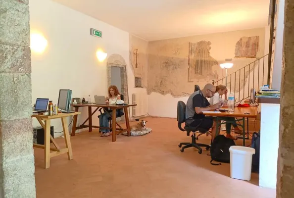 Romano di 46 anni, dopo aver vissuto a Berlino e alle Canarie Mattioli è approdato in Valnerina perché la conosce, da anni fa rafting, torrentismo, trekking, perché viaggia fin da piccolo. “Vivere in un borgo è stato sempre il mio sogno”. La sede può essere una grande casa rustica con varie camere oppure più appartamenti sparsi nel paese. Lavorare in uno spazio comune, qui un ex convento, può diventare difficile se qualcuno, per lavoro, deve parlare a lungo al telefono? “Chi ha un’esigenza del genere può avere altre stanze o confortevoli cabine telefoniche: negli spazi comuni di coworking si viene invitati al silenzio o a fare solo telefonate estremamente brevi”.