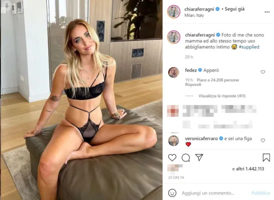 Chiara Ferragni è abituata a provocare i suoi follower e anche stavolta non si è lasciata perdere l’occasione postando le immagini che la vedono fasciata in una tutina aderente in pizzo nero, trasparente e floreale, all'interno della sua cabina armadio.