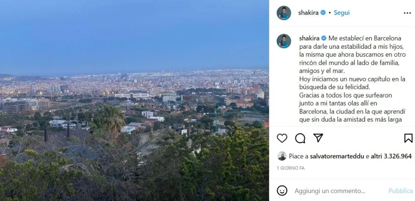 L’addio a Barcellona lo ha dato lei stessa sui social ma la decisione di Shakira di lasciare la città catalana potrebbe non dipendere solo dalla voglia di iniziare una nuova vita. "Mi sono stabilita a Barcellona per dare stabilità ai miei figli, la stessa che ora cerchiamo in un altro angolo di mondo accanto alla famiglia, agli amici e al mare", recita il messaggio della pop star colombiana ma pare che a farle fare i bagagli con un po’ di fretta sia stato “lo sfratto” che le ha dato il 13 marzo scorso l’ex suocero, padre di Gerard Piqué, dall'abitazione di Esplugues de Llobregat, alla periferia di Barcellona.
