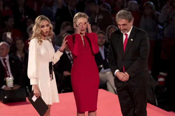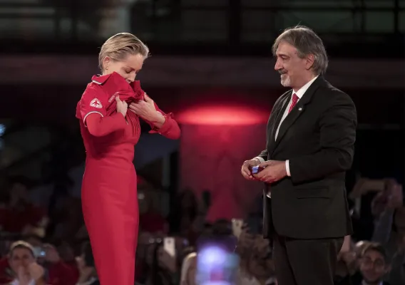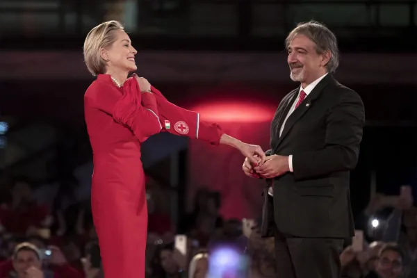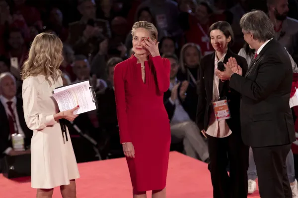La star di Hollywood ha ricevuto dalle mani di Francesco Rocca, Presidente della Croce Rossa Italiana e della Federazione Internazionale delle Società di Croce Rossa e Mezzaluna Rossa, la Medaglia d'Oro al Merito della CRI. Per l’evento migliaia di volontari si sono riuniti al Palazzo dei Congressi dell'Eur di Roma. L’attrice è stata premiata inoltre per il suo fondamentale contributo nella realizzazione della "Città della Pace per i Bambini” in Basilicata e ha ritirato il prestigioso riconoscimento anche per conto di Betty Williams, Premio Nobel per la Pace e ideatrice del progetto. Sharon Stone ha poi voluto indossare la maglia della Croce Rossa Italiana donatale dai volontari e si è intrattenuta con loro alla fine del suo intervento.