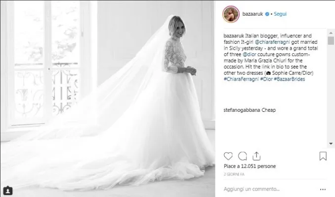 "Cheap". Stefano Gabbana usa una sola parola su Instagram a commento della foto di Chiara Ferragni in abito da sposa postata sul profilo social di Harpers' Bazar Uk. Per lo stilista il vestito creato per lei da Maria Grazia Chiuri per Dior è a 'buon mercato': questa la traduzione in italiano di "cheap". Il commento scatena i followers e, come capita sempre, qualcuno si schiera dalla parte di Gabbana ma in molti lo attaccano arrivando a parlare di gelosia. "Geloso io? - replica lo stilista - Hahahaha nooooo!!! E perché?".