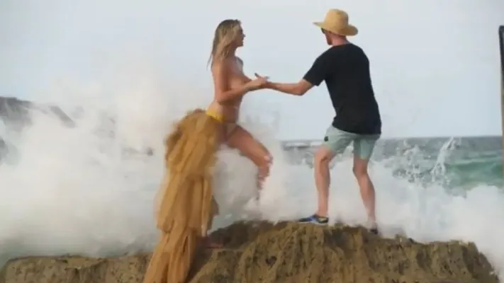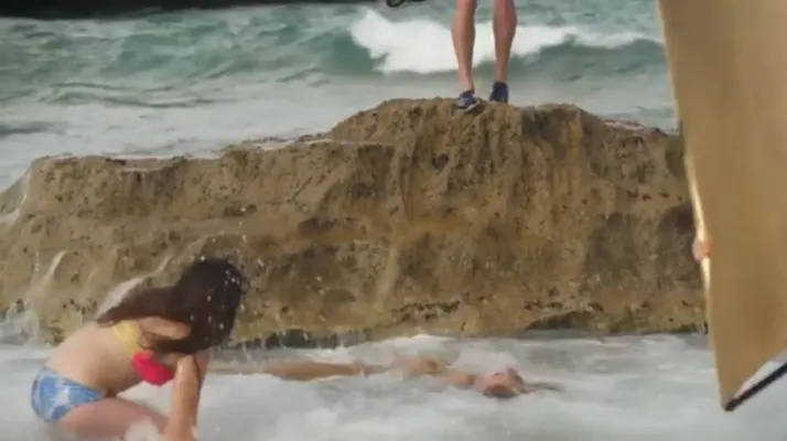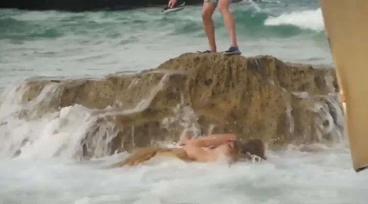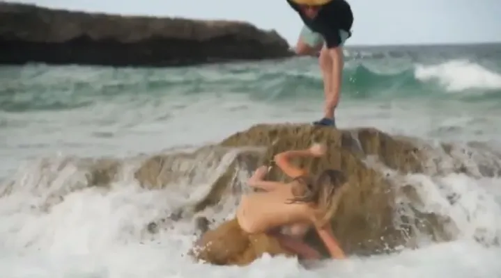 Sono stati inutili i tentativi dell’assistente di fornirle sostegno, la modella è sbalzata via dallo scoglio finendo quasi senza mutande in mezzo al mare.