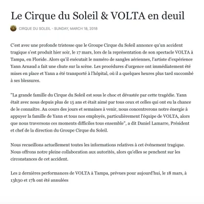 Il trapezista francese Yann Arnaud, 38 anni, si stava esibendo quando è caduto al suolo. "Le procedure d'emergenza sono state immediatamente attivate e Yann è stato trasportato al più vicino ospedale, dove successivamente è morto a causa delle ferite riportate", si legge nella nota. "L'intera famiglia del Cirque du Soleil è scioccata e distrutta da questa tragedia", ha affermato il Ceo della compagnia, Daniel Lamarre, "Yann era con noi da più di 15 anni ed era amato da tutti coloro che hanno avuto la possibilità di conoscerlo".