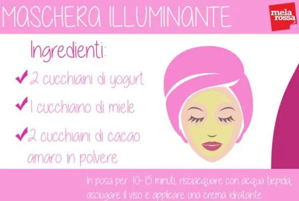 (www.melarossa.it) Maschera illuminante: Questa maschera è l?ideale per nutrire e illuminare la pelle: miscela accuratamente tutti gli ingredienti fino ad ottenere un composto né troppo denso né troppo liquido e applicalo sulla pelle. Lo yogurt ed il miele contribuiscono a donarti un colorito sano e naturale, mentre il cacao ha una funzione illuminante e antiossidante, grazie all'elevato contenuto di polifenoli. Copyright: Melarossa