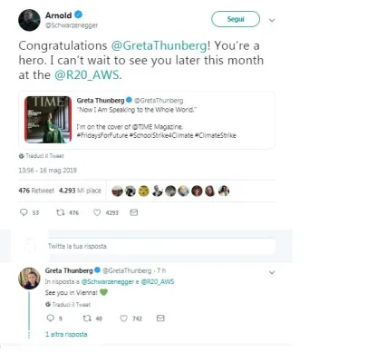 Nel suo 'cinguettio' Schwarzenegger include anche il tweet della giovane attivista svedese con la prossima copertina di 'Time' a lei dedicata. "Ci vediamo a Vienna" risponde la 16enne, simbolo della battaglia ambientalista contro i cambiamenti climatici.