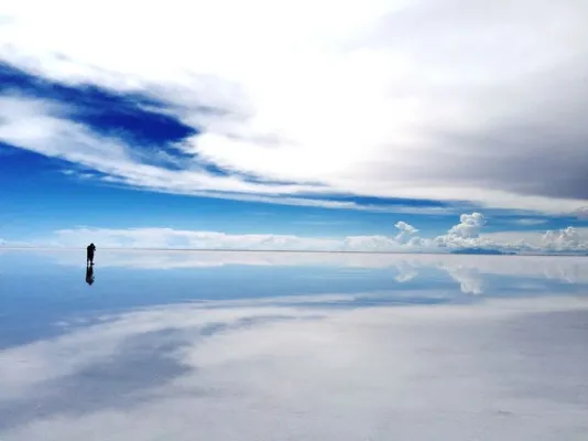 Quando la superficie è asciutta, tutto intorno diventa di un bianco accecante, ma quando c'è un po' d'acqua le nuvole e il cielo si riflettono, così che diventa impossibile distinguere l'orizzonte.