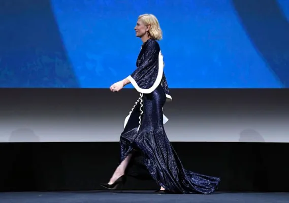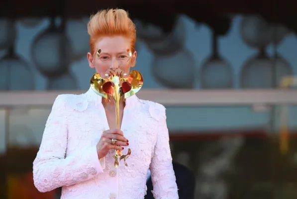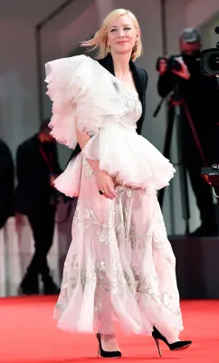 Ha optato invece per il bianco siderale della maison Chanel l'iconica Tilda Swinton. Ma lei è un'aliena e non rischia di cadere nell' effetto sposa, semmai in quello David Bowie Sturdust, anche per via dei capelli rossi cotonati vero l'alto, del collo svettante dell'abito e delle lunghe maniche scampanate. Bocciate le decolletée grige con patta alta sul collo del piede stile Rococò: accorciano la sua longilinea figura da modella.
