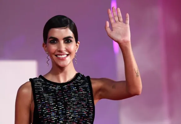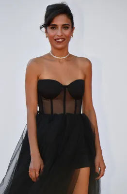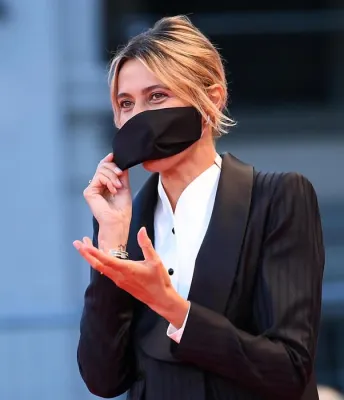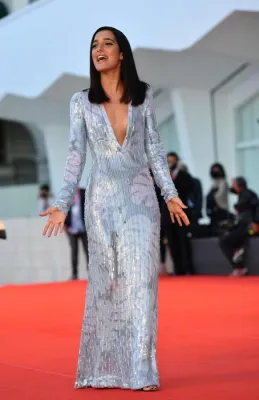L'attrice vi abbina orecchini pendenti Bvlgari e un anello con zaffiro al dito una mise impeccabile che, con il precedente abito di Giorgio Armani tutto ricamato con cristalli sul busto, le fa aggiudicare la palma dello stile più glamour del red carpet, un titolo che ha conquistato già dalla sua prima uscita al festival indossando uno smoking nero a righe lucido-opaco di Emporio Armani, con mascherina sul viso, total black, ovviamente.