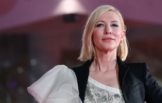 Bianco e nero, look maschili con giacche e pantaloni a volte troppo ampi per Cate Blanchett, presidentessa della giuria della 77ma Mostra internazionale del cinema di Venezia.