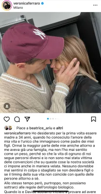 Veronica Ferraro, influencer, conosciuta anche per essere una grande amica di Chiara Ferragni, desidera diventare madre e ha raccontato su Instagram, la sua scelta: "Ho desiderato per la prima volta essere madre a 34 anni, quando ho conosciuto l’amore della mia vita e l’unico che immaginavo come padre dei miei figli". Si riferisce a Davide Simonetta, il produttore e autore musicale con cui fra poco si sposerà. "Ormai la maggior parte delle mie amiche attorno a me aveva già una famiglia, ma non l’ho mai sentito come un peso, perché so che la vita di ognuno di noi segue percorsi diversi e io non sono mai stata vittima delle convenzioni che su queste cose la nostra società ci impone anche in maniera velata. Nessuno dovrebbe mai sentirsi in colpa o sbagliato se non desidera figli o se il timing della sua vita non coincide con quello delle persone attorno a sé".